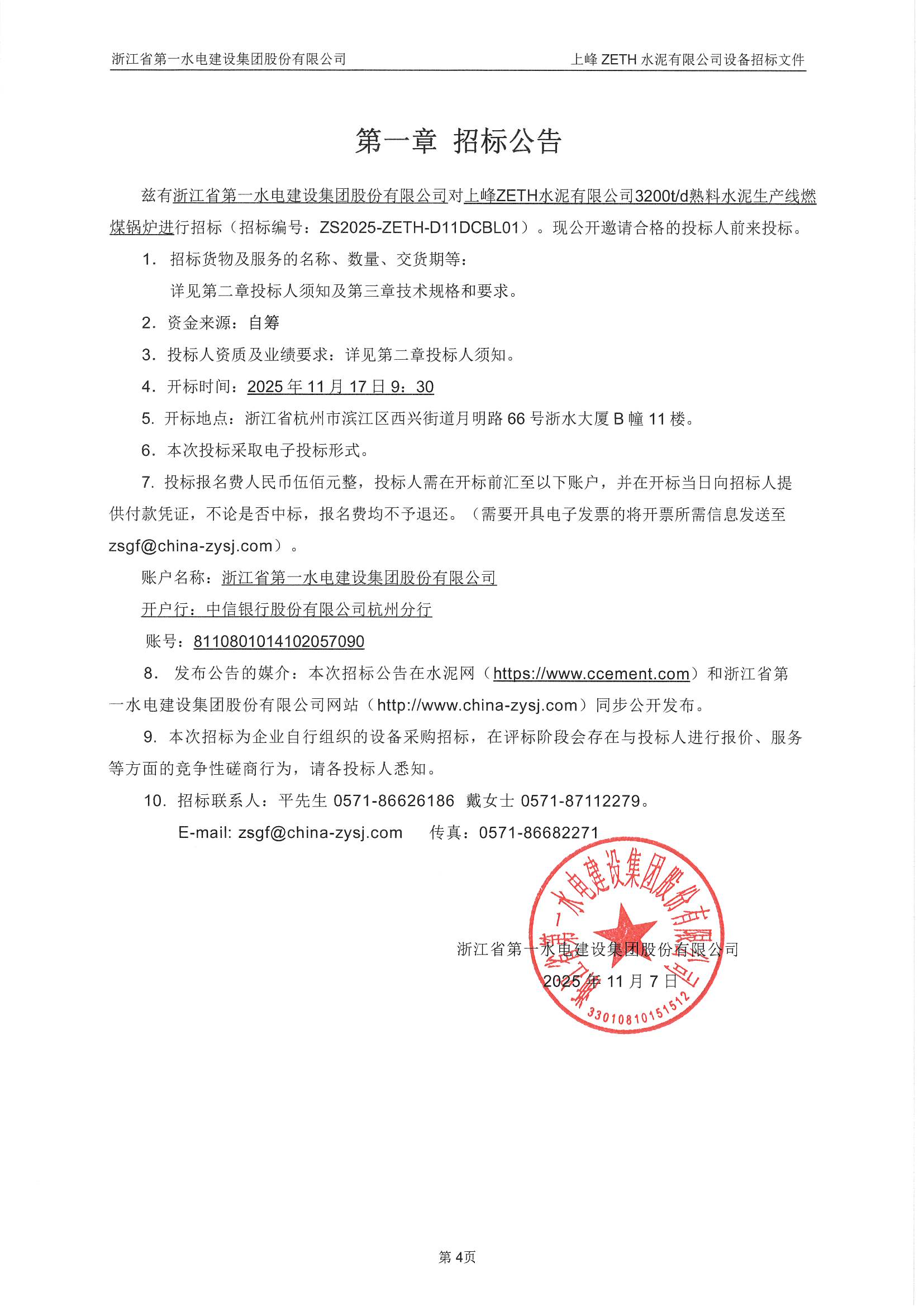上峰ZETH水泥有限公司3200t/d熟料水泥生產線燃煤鍋爐招標公告