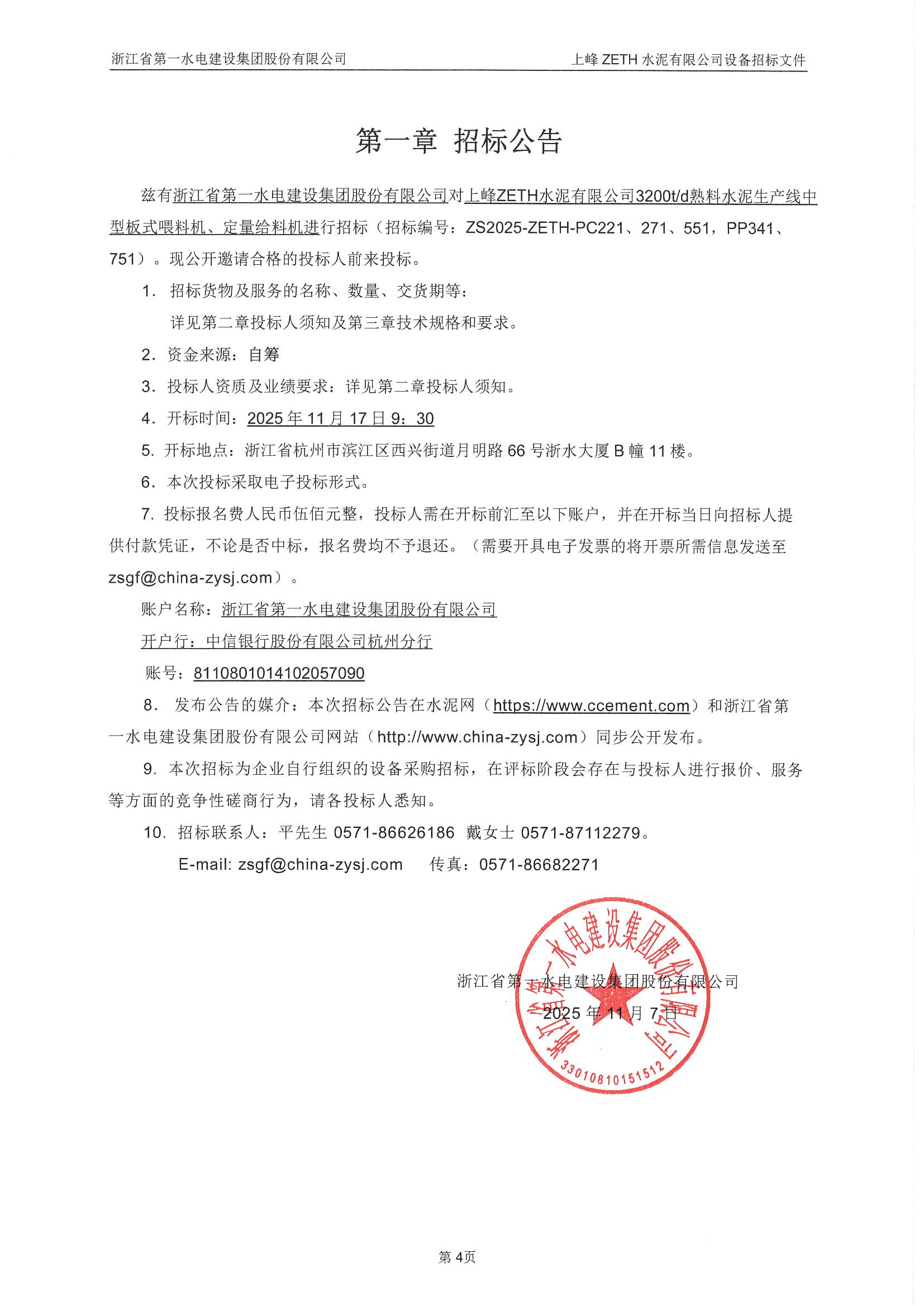 上峰ZETH水泥有限公司3200t/d熟料水泥生產線中型板式喂料機、定量給料機招標公告